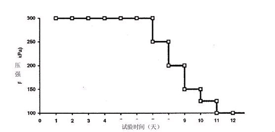在100KPa內(nèi)袋壓強(qiáng)下,繼續(xù)對樣品進(jìn)行負(fù)荷循環(huán)24小時。然后,將管中的水換成空氣。保持管中的氣壓處于30KPa(0.3巴),在100KPa內(nèi)袋壓強(qiáng)下,再繼續(xù)對樣品進(jìn)行負(fù)載循環(huán)24小時。