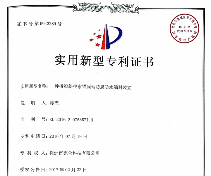 產品專利:實用新型專利證書《一種橋梁斜拉索錨固端防腐防水端封裝置》