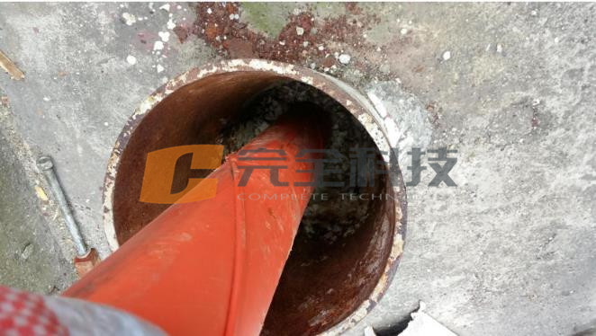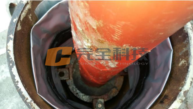 第一步,打開防雨罩,拆除減震器,對管孔內填充的發泡膠進行清除,為安裝防水密封氣囊提供條件。
