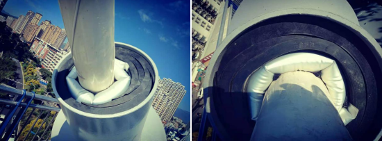 該密封系統技術對比原灌注聚氨酯發泡劑和防腐油脂的方式,最大特點和優勢體現在核心產品密封氣囊的抗震性和密封持久性。依據2018年4月頒布的湖南省地方標準《充氣型管道防水堵漏裝置》(標準編號:DB43/T 1396-2018 )顯示,密封氣囊產品經受振幅10mm頻率10Hz持續168h的震動檢測結果為合格。當對密封氣囊充氣氣壓達到2.8-3公斤時,可以把索導管內壁與拉索之間的空隙完全密封死。基于密封氣囊柔性密封的特性,橋梁拉鎖傳導的震動不會對密封氣囊造成破壞性影響,充氣后的密封氣囊始終與橋梁拉鎖和索導管形成緊密連接。并且密封氣囊的充氣孔設計在面對管道內壁,當充氣管拔除后,充氣孔處于密閉空間,不存在外露慢性漏氣的問題。因此,密封氣囊的密封有效性長達10年以上。