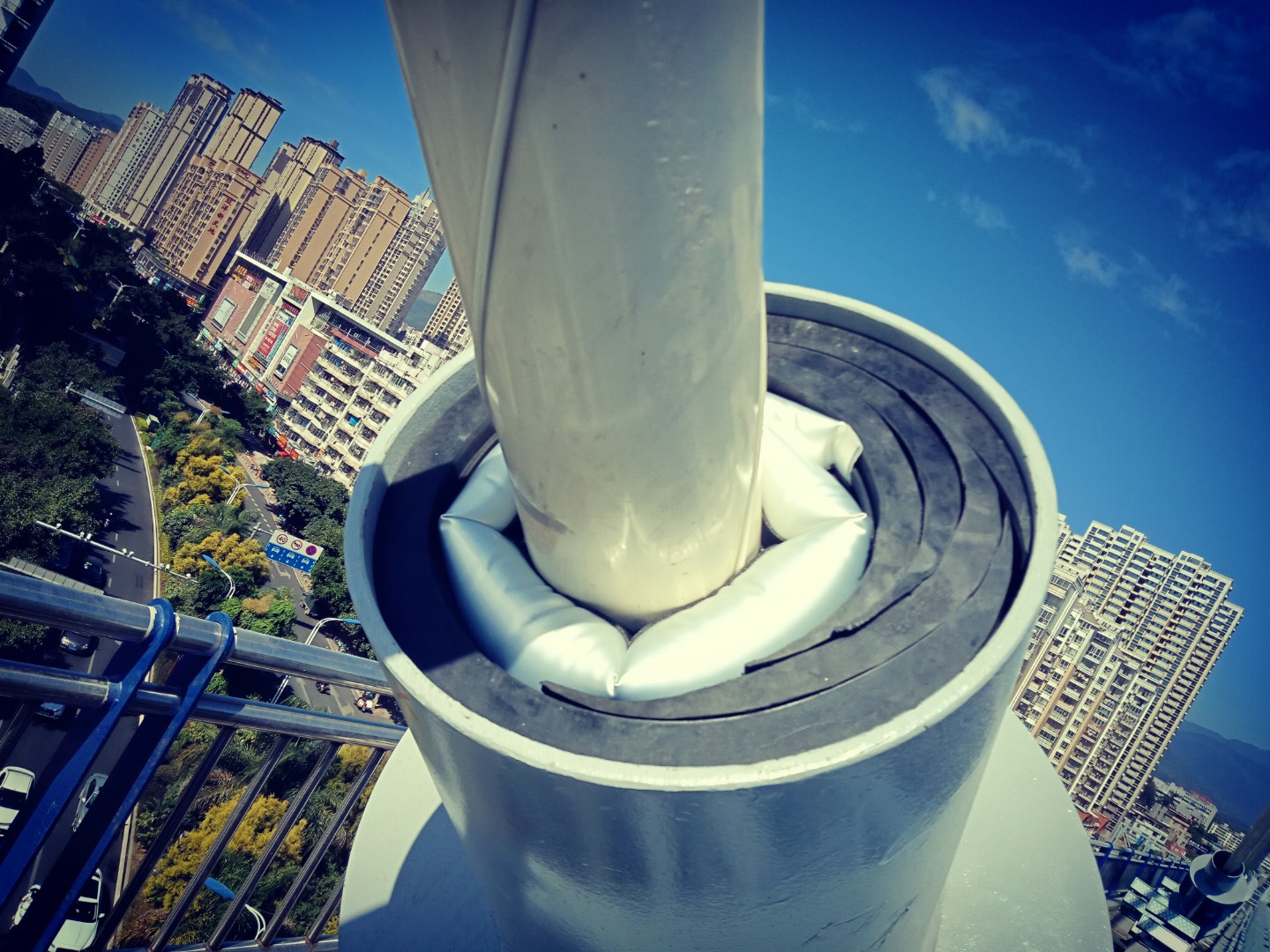2、第一步,安裝變徑橡膠襯套。先要對橡膠圈外側(cè)中縫凹槽貼緊一圈防水密封膠帶,在圍繞斜拉索放入索導(dǎo)管孔內(nèi),橡膠圈外壁與索導(dǎo)管內(nèi)壁貼緊。再針對纜索偏心情況,用月牙型襯套對較寬的空隙進(jìn)行填補,使得纜索周圍的空隙寬度處于2-4厘米的均勻?qū)挾取a槍τ?層以上材料重疊的,需要使用輔助氣囊的膨脹壓力,使得多層材料之間的夾縫密合嚴(yán)實。